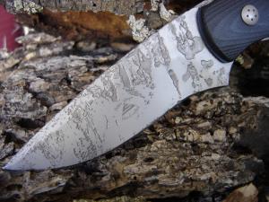 Introducing "Crator" a new and exciting random process that forms part of the 12C27 blade steel without compromising any of the qualities of the steel. The first knives created with this finish were introduced to the public at the 2007 Durban Easer Knife Show with enthusiastic acceptance. The official launch took place at the 2007 SA Guild of Knifemakers Show on 31st August. I am pleased to report that interest in the finish continues to escalate and all pieces displayed were quickly acquired by enthusiastic buyers.